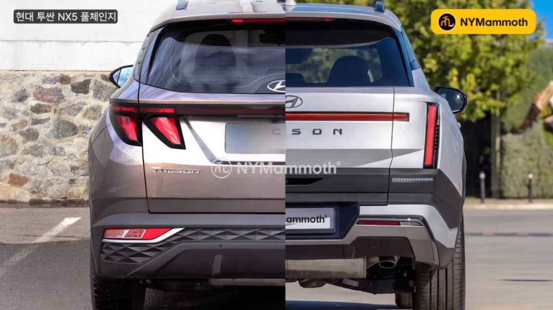 유튜브 채널 ‘NYMammoth’가 공개한 후면 렌더링에 따르면 신형 투싼은 현행 모델의 유려한 파라메트릭 곡선을 과감히 버리고, 싼타페의 직선 위주 강인한 디자인 언어를 채택한다.