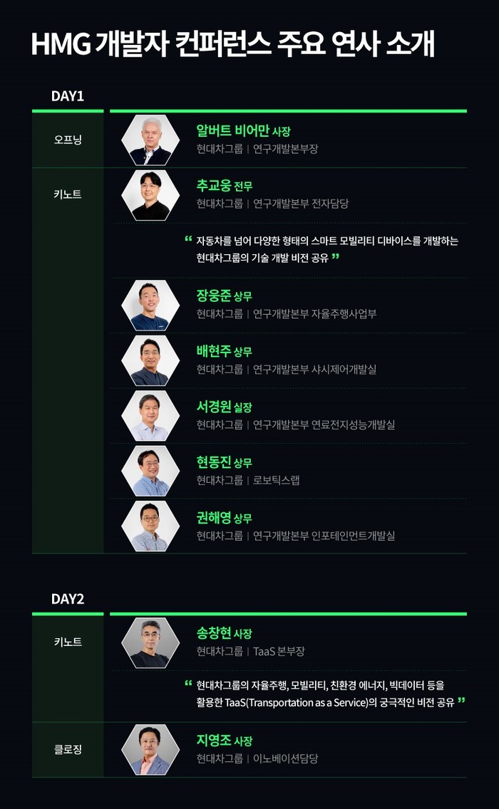 본격적인 컨퍼런스 진행에 앞서 현대차그룹의 R&D 스타급 리더들의 사전 발표도 예정돼 있다. 먼저, 연구개발본부 알버트 비어만 사장은 오프닝 연설을 맡아 현대차그룹의 연구 및 기술개발 현황과 방향성을 소개한다. “현대차그룹은 향후 모빌리티, AI, 커넥티드 서비스 등을 아우르는 사용자와 자동차의 초연결 통합플랫폼을 제공하고자 SDV 개발을 가속화하고 있으며, 이를 위한 여정에 수많은 우수 개발자들이 함께 매진하고 있다”라는 점이 주된 메시지다.