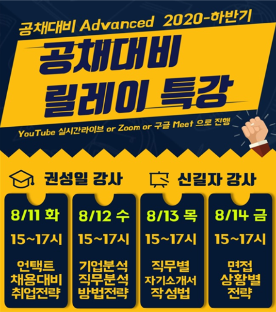 세종대학교(총장 배덕효) 대학일자리사업단은 취업을 준비하는 졸업생, 재학생들을 대상으로 8월 11일부터 14일까지 총 4일간 ‘2020 하반기 공채대비릴레이 특강’을 진행한다.