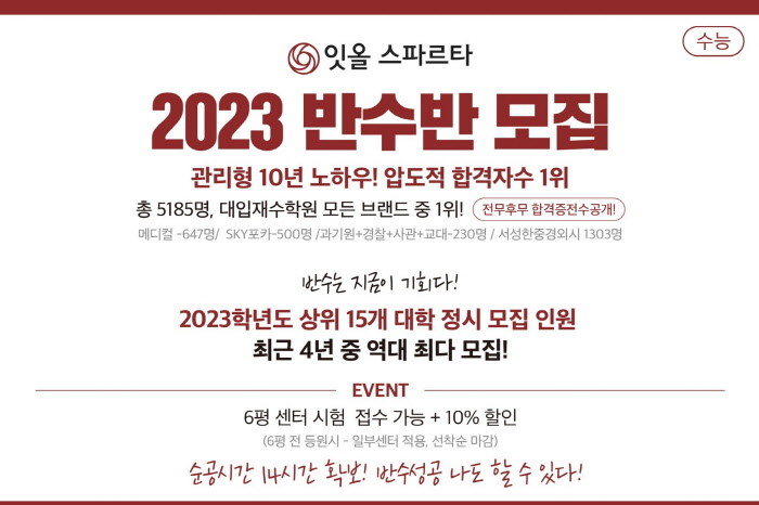 잇올 스파르타 관계자는 “2023학년도 상위 15개 대학에서 정시 모집 인원이 늘어나 최근 4년 중 역대 최다로 모집해 올해 반수의 기회다”라며, "잇올 스파르타는 연간 예상 10만명 이상의 학생이 찾는 독학재수학원, 관리형 독서실로 단순히 강의 교재 콘텐츠 제공과 학습장소 제공에 포커스를 맞췄던 기존의 틀에서 벗어나 성적 향상을 위한 융합형 초개인화 큐레이션 시스템을 지향하고 있다”라고 전했다.