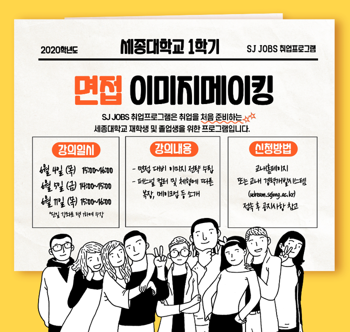 세종대학교(총장 배덕효) 취업지원과는 6월 4일부터 6월 11일까지 온라인 SJ JOBS 취업 프로그램 ‘면접 이미지메이킹’을 진행한다.