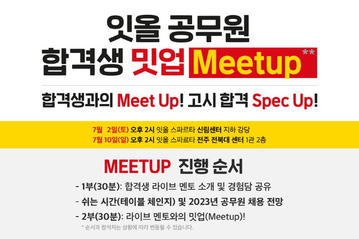 관리형 1위 에듀테크 전문기업 잇올그룹의 독학재수학원 관리형 독서실 잇올 스파르타, 잇올 관리형 스터디카페, 온라인 관리형 독서실인 온라인 플랫폼 잇올 캠스터디가 오는 7월 2일(토)과 10일(일)에 7급과 9급 공무원 준비생을 위한 잇올 공무원 합격생 밋업 행사를 갖는다고 전했다.