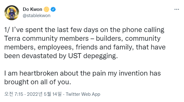 13일(현지 시각) 권 CEO는 이날 자신의 트위터를 통해 “지난 며칠간 UST 디페깅(Depegging·달러와의 가치 유지 실패 현상)으로 엄청난 충격을 받은 테라 커뮤니티 회원과 직원, 친구, 가족과 전화를 했다”라며 “내 발명품(루나·UST)이 여러분 모두에게 고통을 줘 비통하다”고 밝혔다.