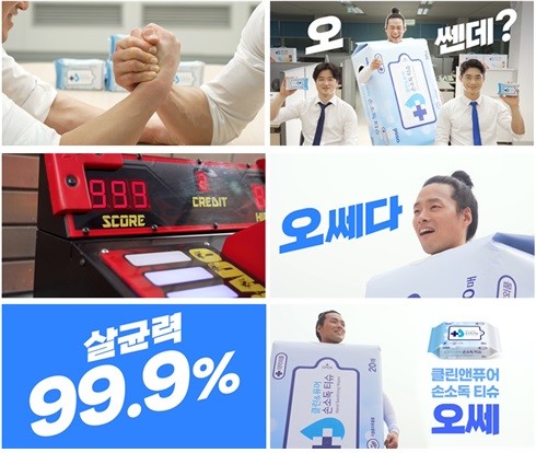 공개된 영상은 ‘클린앤퓨어 손소독티슈’ 모양의 의상을 입은 남성이 등장해 힘을 자랑하는 상황에서 ‘오쎄다’라는 중의적 표현을 반복하며 손소독티슈의 특징을 유머러스하게 소개한다.