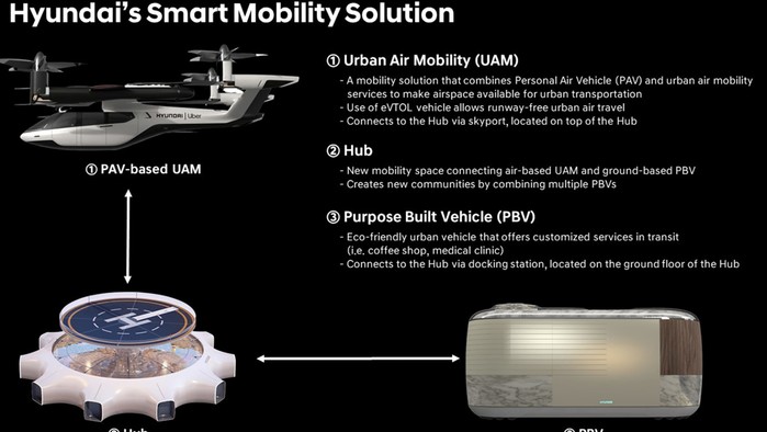 현대차는 도시민들이 앱을 사용해 eVTOL 차량을 부르고, 수직 이착륙 비행장(vertiport)에서 탑승한 후, 도시를 날아 목적지 부근 착륙 지점까지 이동, 전기 스쿠터를 사용해 최종 목적지에 도착하는 시스템을 계획하고 있다.