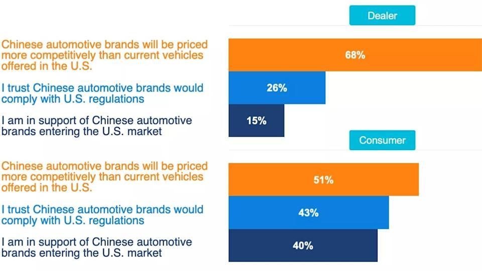 중국 전기차의 미국 시장 진출에 대한 시각도 엇갈렸다. 소비자의 40%는 중국 전기차의 미국 시장 진입을 지지한다고 답했다. 반면 딜러의 지지율은 15%에 그쳤다. 소비자 지지율이 딜러보다 약 2.5배 높은 셈이다.