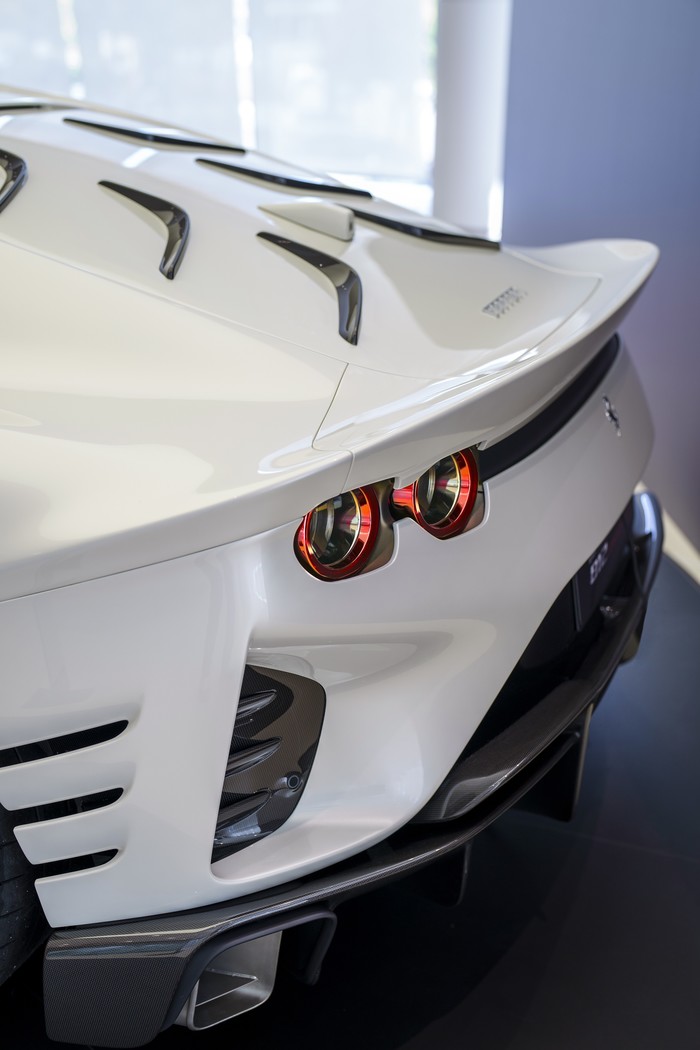 공기역학적으로는 합법적으로 공도 주행이 가능한 차량 중 가장 극단적 형태의 솔루션을 만들어 냈다. 새로운 에어덕트에서부터 특징적이고 독특한 테일 및 배기 구성, 그리고 특허를 받은 리어 스크린과 프론트 범퍼의 디자인에 이르기까지의 “형태는 항상 기능을 따라야 한다”는 페라리의 확고한 신념을 충실히 표현하는 데 주력했다.