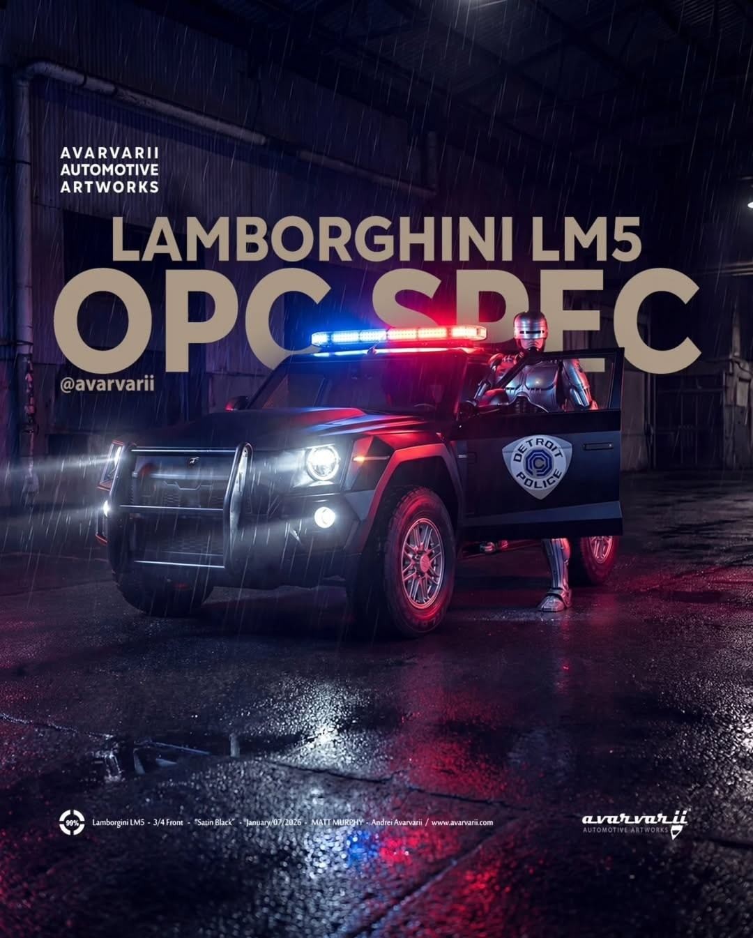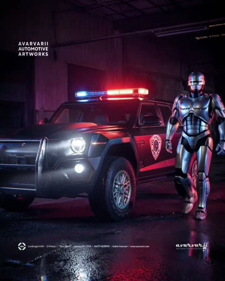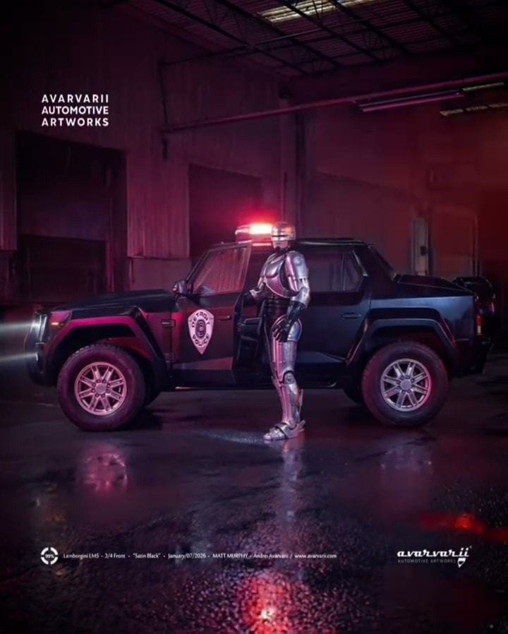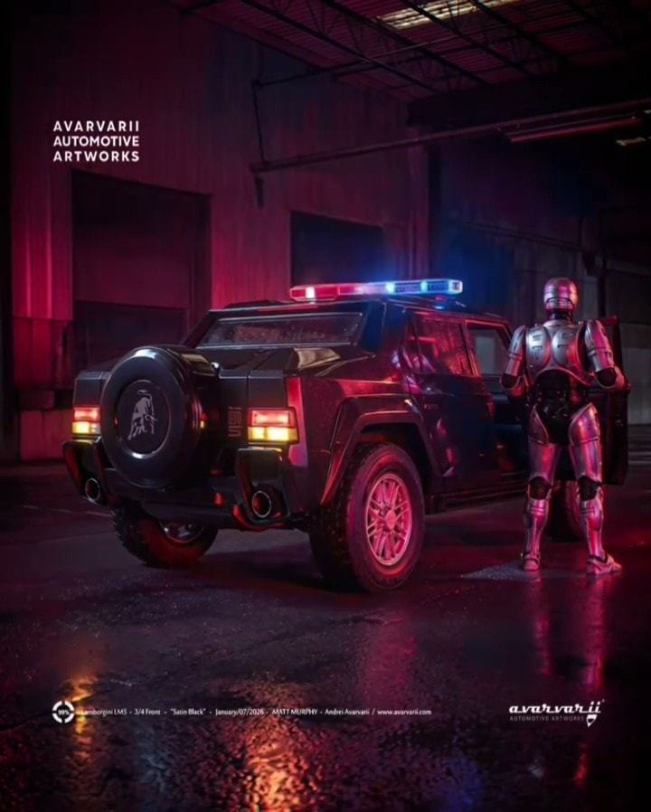 설정도 독특하다. 운전석에는 1987년 동명의 영화에 등장했던 캐릭터 ‘로보캅(RoboCop)’이 탑승한 모습으로 연출됐다. 공격적인 디자인의 LM5와 로보캅이라는 상징이 결합하면서, 이 차량은 범죄와 맞서는 디스토피아적 미래 세계에서 등장한 듯한 분위기를 자아낸다.