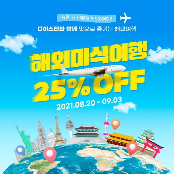 디아스타는 외식브랜드 릴레이 기획전으로 8월 27일까지 ‘피자 브랜드 할인전’, 9월 3일까지 ‘해외 음식 할인전’을 전개한다.