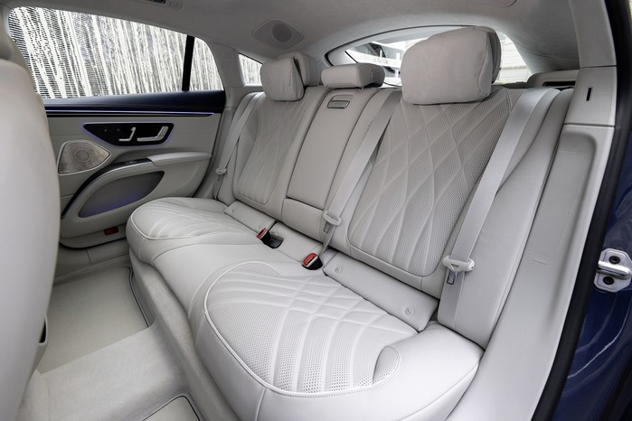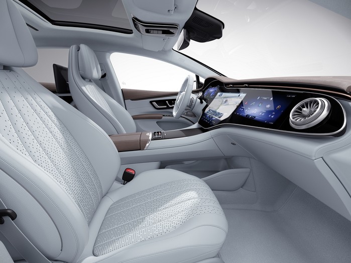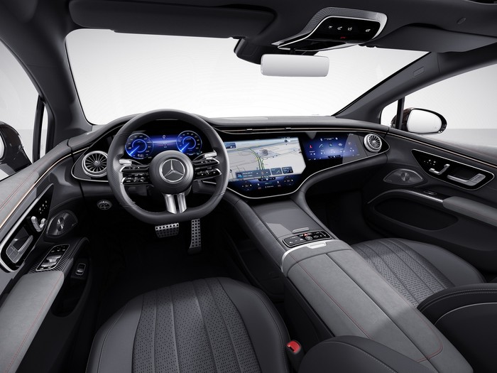 더 뉴 EQS의 실내는 새로운 센터콘솔 디자인이 적용됐다. 센터콘솔의 전면부는 계기판과 연결되어 공중에 떠 있는 듯한 자유로운 실내 공간을 연출하며, 동시에 하부에는 수납 공간을 확보해 실내 공간의 활용성을 높였다.