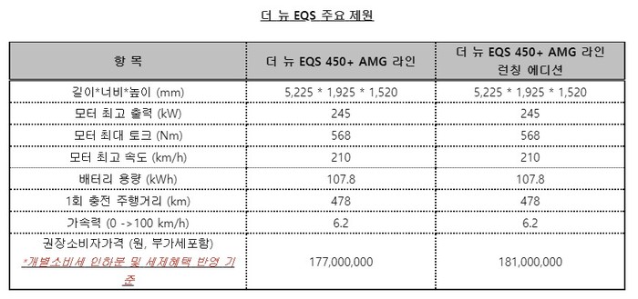 메르세데스-벤츠 코리아는 국내에 더 뉴 EQS 450+ AMG 라인과 더 뉴 EQS 450+ AMG 라인 런칭 에디션을 우선적으로 선보이고, 향후 보다 다양한 더 뉴 EQS의 라인업을 소개할 예정이다. 더 뉴 EQS 450+ AMG 라인 및 더 뉴 EQS 450+ AMG 라인 런칭 에디션의 주요 제원과 권장 소비자 가격은 아래 표와 같다.