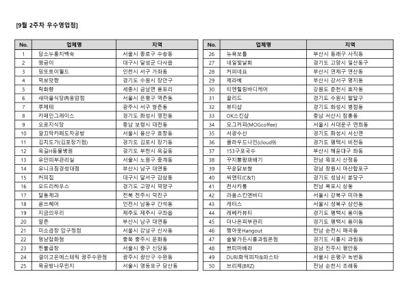아울러 ‘뉴욕보틀’, ‘네일빛날회’, ‘커피네요’, ‘제라베’, ‘티엔힐링바디케어’, ‘끌리드’, ‘뷰티샵’, ‘OK스킨샵’, ‘모그커피(MOGcoffee)’, ‘서광수산’, ‘클라우드나인(cloud9)’, ‘153구포국수’, ‘꾸지뽕왕꽈배기’, ‘꾸운닭보쌈’, ‘씨앤티(C&T)’, ‘천사카롱’, ‘라움스킨앤바디’, ‘캐터스’, ‘레베카뷰티’, ‘더나은피부관리’, ‘행아웃Hangout’, ‘솔밭가든시흥과림본점’, ‘쁘띠마베라’, ‘DURI화덕피자&파스타’, ‘브리제(BRZ)’ 등 총 50여 업체가 명단에 올랐다.