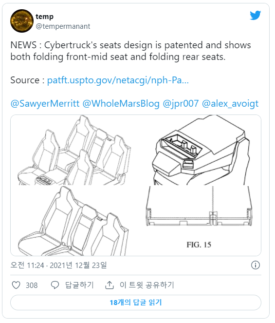 최근 테슬라에서 등록한 특허 사항을 보면 사이버트럭이 분할 폴딩 2열 시트를 선보일 것이 유력하다.