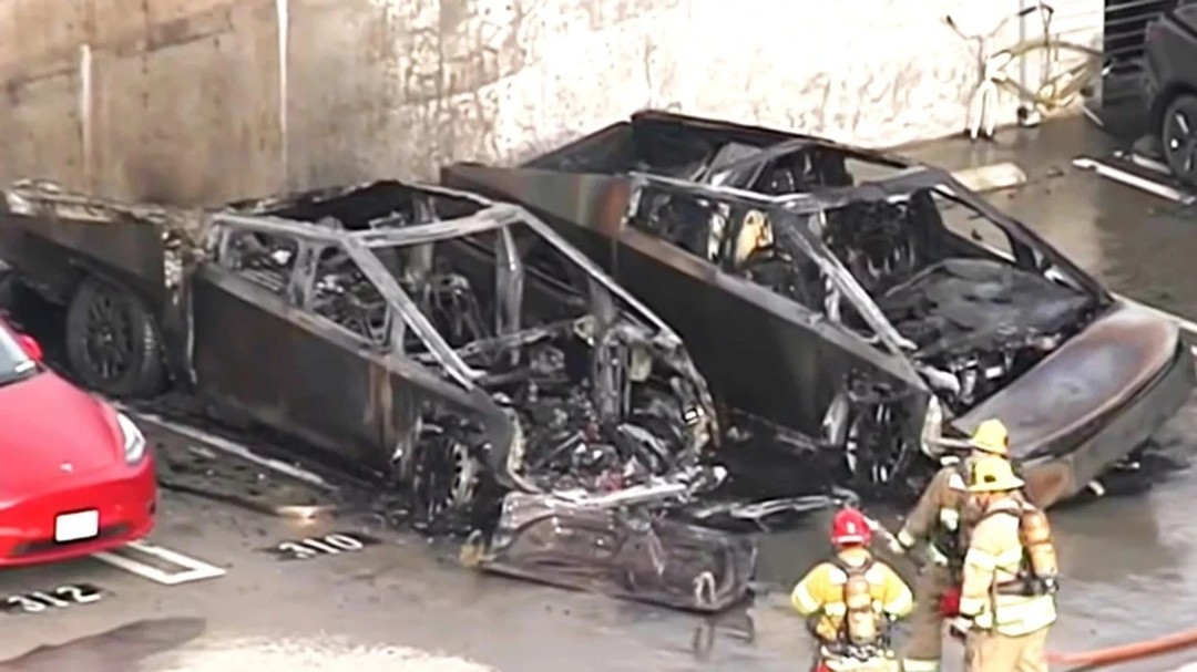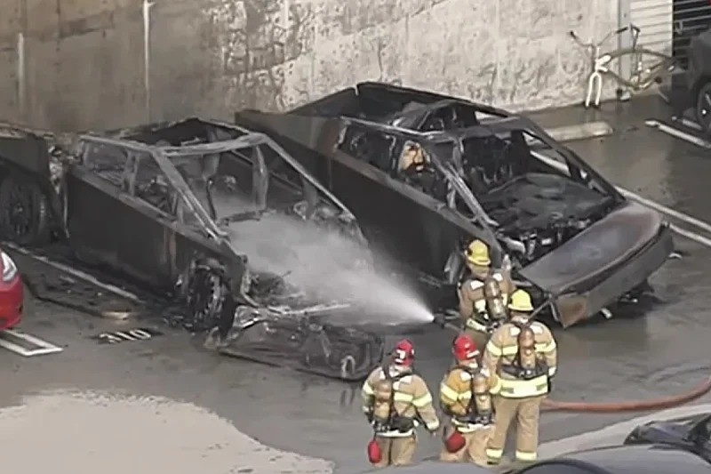 나란히 주차돼 있던 두 대의 테슬라 사이버트럭이 화재로 전소됐다. 현재까지 정확한 화재 원인은 확인되지 않았다.