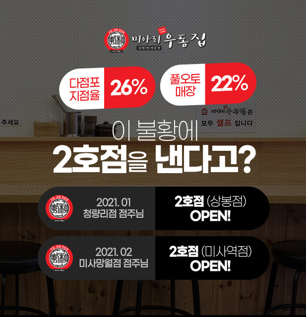 작년 초, 청량리 점주님과 망월 점주님은 어려운 시기임에도 각각 2번째 매장을 오픈했다. 미아리우동집의 류제선 대표는 가맹사업 확장에 뜻이 없었지만 점주님들이 창업 후 행복해하시는 모습을 보고 마음을 바꾸었다. “가맹사업에 큰 뜻이 없었지만 몇몇 점주님들이 고마워하시며 2호점을 여시는 모습을 보고 감동을 받았다. 점주님과의 상생을 몸으로 실천하는 본사가 되고 싶다.”라고 전했다.
