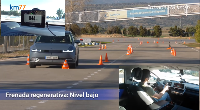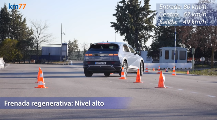 처음 시도에서 아이오닉 5는 시속 77km의 속도로 급우회전을 하다가, 바로 이어지는 좌회전 코스에서 제대로 제어하지 못해 트래픽 콘을 쓰러트렸다. 이후 회생 제동을 3단계로 높인 후 재시도를 하자, 가속 페달을 밟으면서도 시속 80km의 속도로 안정적으로 주행을 마무리했다. 아이오닉 5의 회생제동 기능이 내연기관차와 유사한 감속력을 보여주며 급선회 시 차량 통제가 가능하게끔 해준다는 것을 알 수 있는 대목이다.