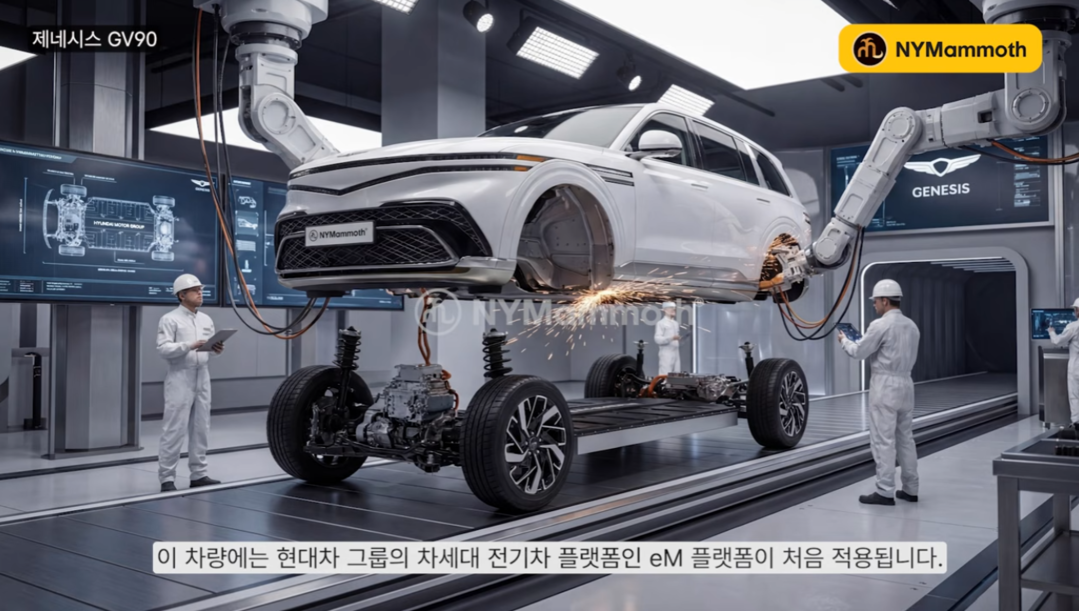 GV90은 현대차그룹의 차세대 전기차 플랫폼 eM을 기반으로 개발된다. 배터리 용량은 113kWh 이상, WLTP 기준 주행거리는 약 400~500마일(643~804km)이 예상된다. 듀얼 모터 기반 사륜구동 시스템이 적용되며 출력은 약 500~600마력 수준이 될 전망이다.