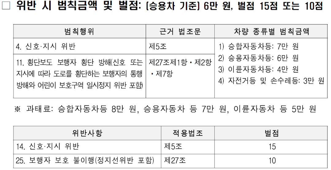 이를 위반하면 승용차 기준 범칙금 6만 원과 벌점 10점이 부과된다.