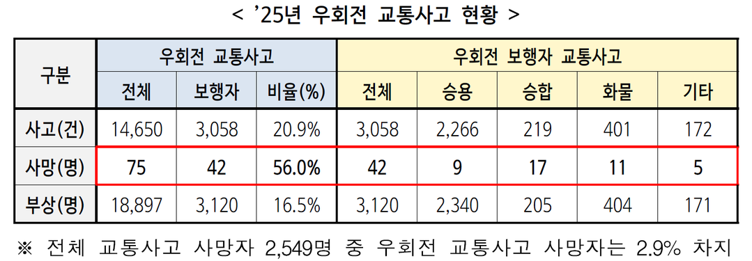 실제 사고 위험도 높은 수준이다. 지난해 우회전 교통사고는 1만 4,650건 발생해 75명이 사망하고 1만 8,897명이 다쳤다. 특히 사망자 중 56%인 42명이 보행자로, 전체 교통사고 사망자 대비 보행자 비중보다 훨씬 높은 수치다.