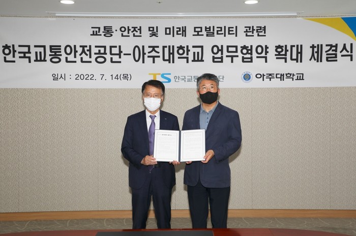 한국교통안전공단(이사장 권용복)은 14일(목) “아주대학교(총장 최기주)와 안전한 미래 모빌리티 상용화를 위해 ‘인재육성 및 연구 분야 협력 강화를 위한 업무협약’을 체결했다.”고 밝혔다.